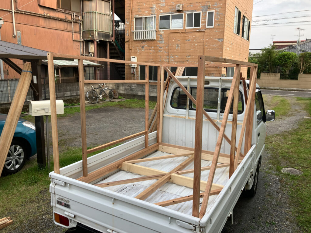 そんなサンバーに自転車を積んで、かつ車中泊もできるようにしたいので、荷台に小屋を建ててなんちゃってキャンピングカー化させました。