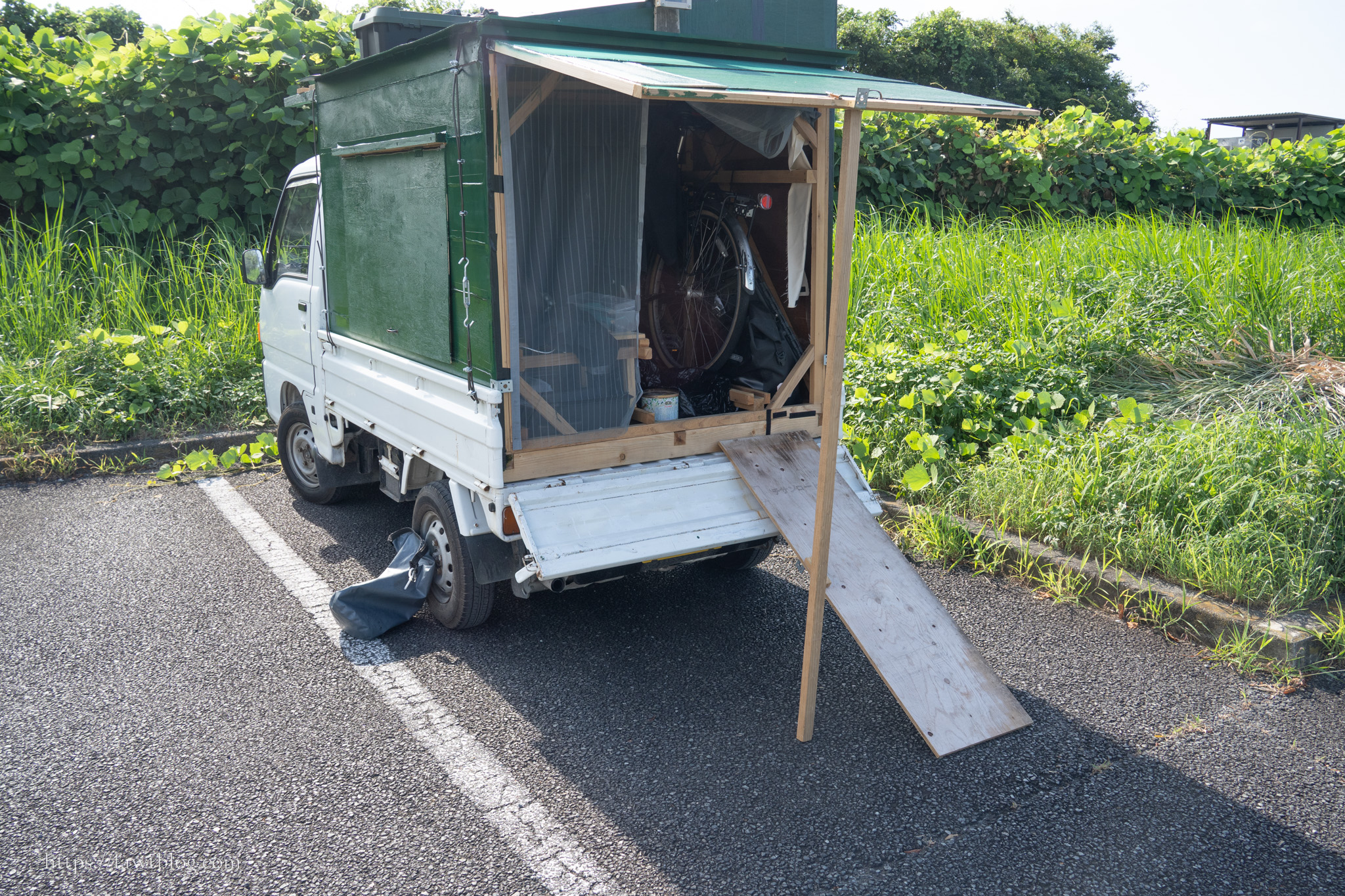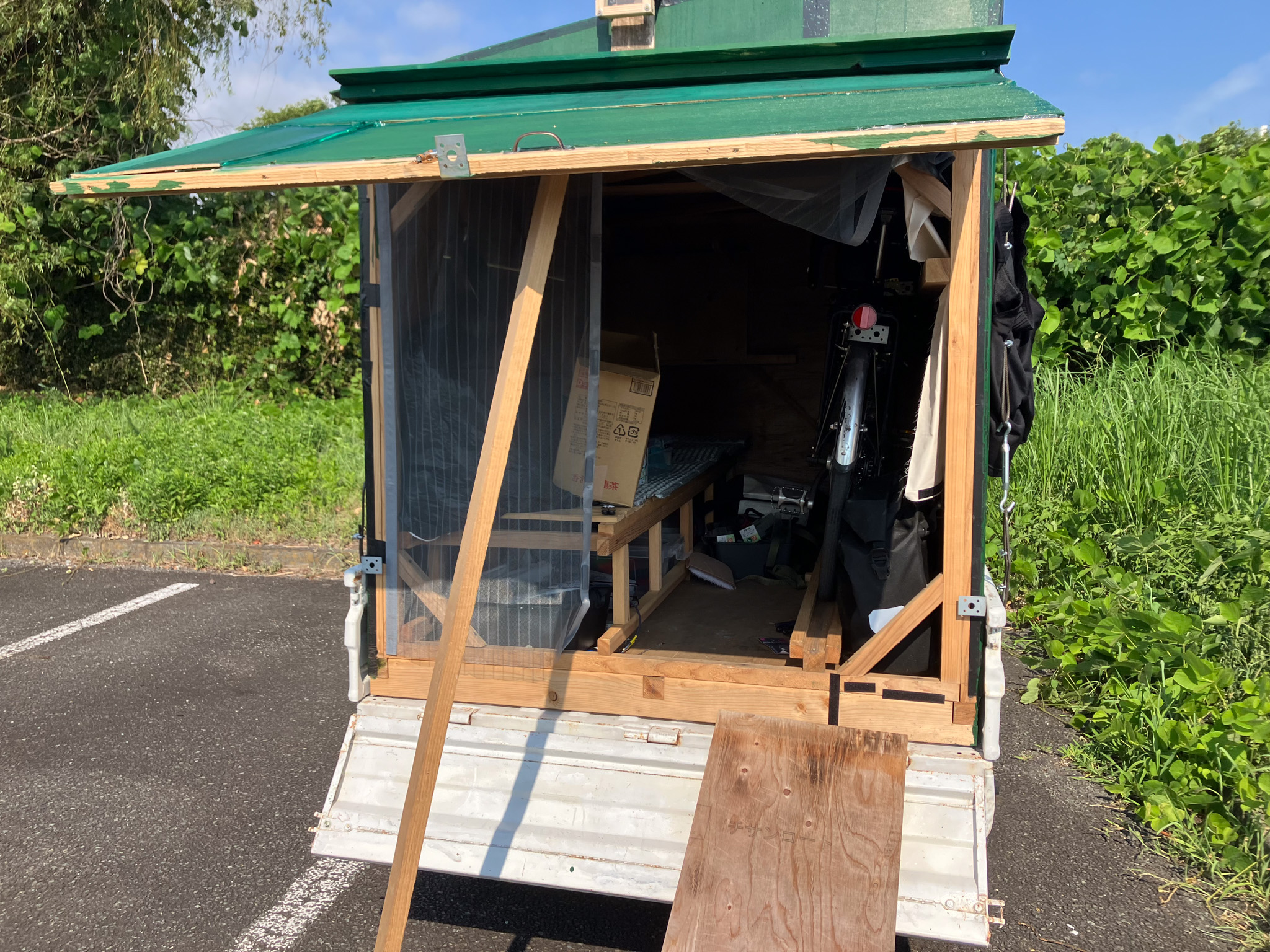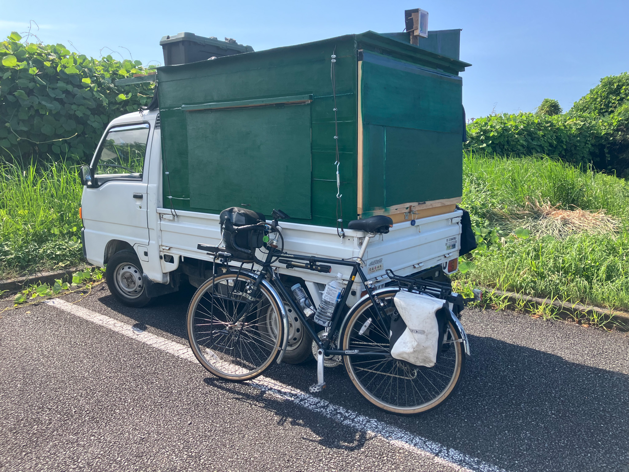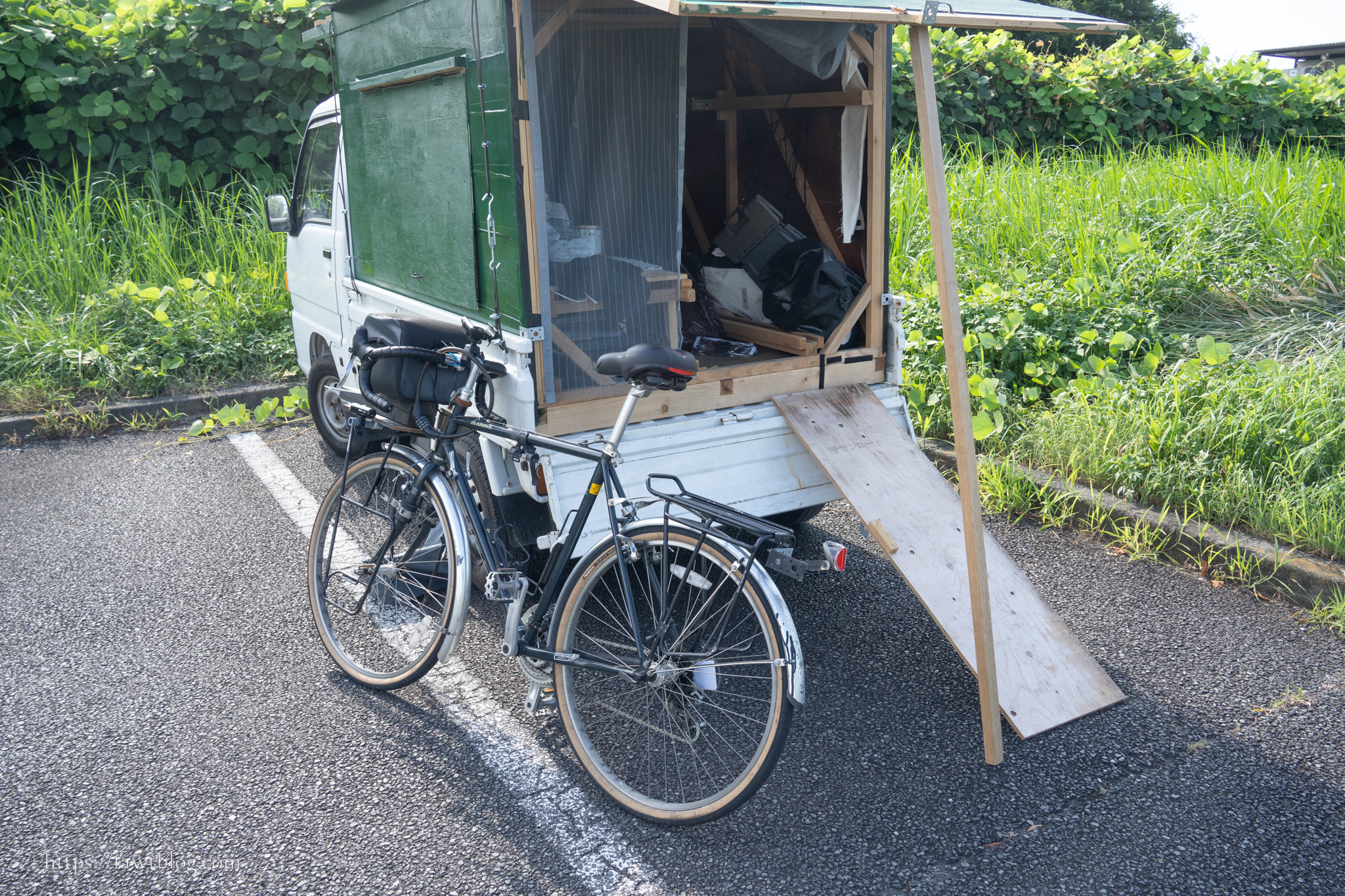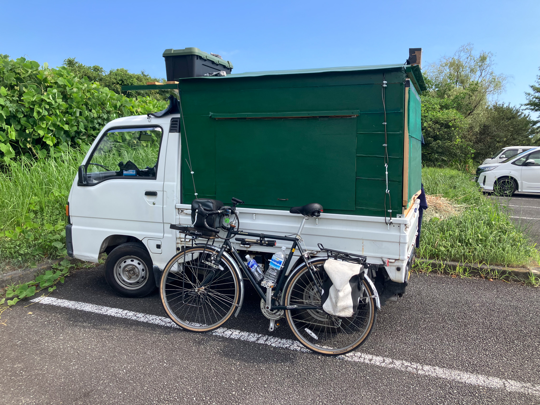 顕れ出でるはマイ自転車。日本一周を成し遂げた歴戦のチャリです。今回はこの自転車を積んで全国を巡るために、わざわざ小屋を積んでいるといっても過言ではありません。