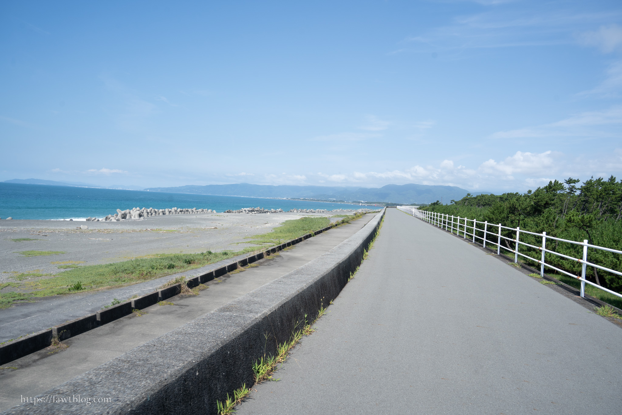 次はいよいよ、気持ちのいいサイクリングの時間です。東田子の浦駅は海に近く、南へ進むとすぐに湾岸道路へ出られます。ここは車が通らない区間なので、安心してペダルを踏むことができます。もっとも、歩行者も利用している道なので、スピードを出しすぎず安全第一で進みましょう。