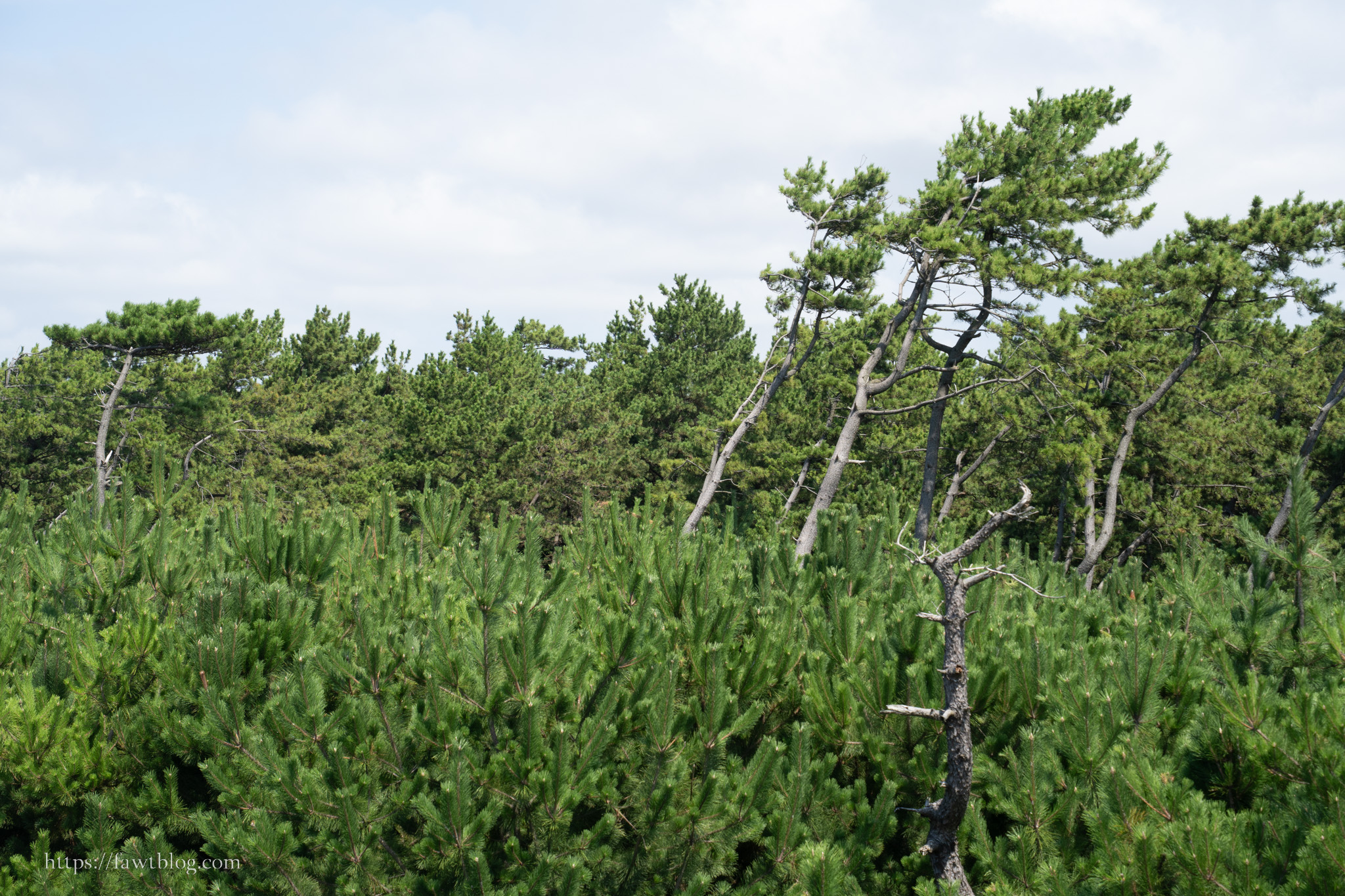 写真を見ると、防風林の枝が風にあおられて斜めに伸びているのがわかるでしょう。その姿からも、この地に吹く潮風の力強さが伝わってきます。