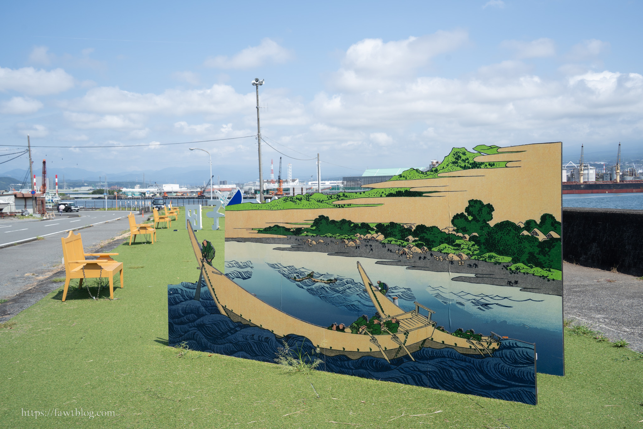 気持ちのいい湾岸サイクリングを楽しんだあとは、次なる三十六景ポイントへ。ここには、すぐそばに「東海道江尻田子の浦略図」の切り抜きパネルが設置されており、今回の「富嶽三十六景を辿るサイクリング」というテーマにまさにぴったりの場所。まるで取材のために用意されていたかのようです。