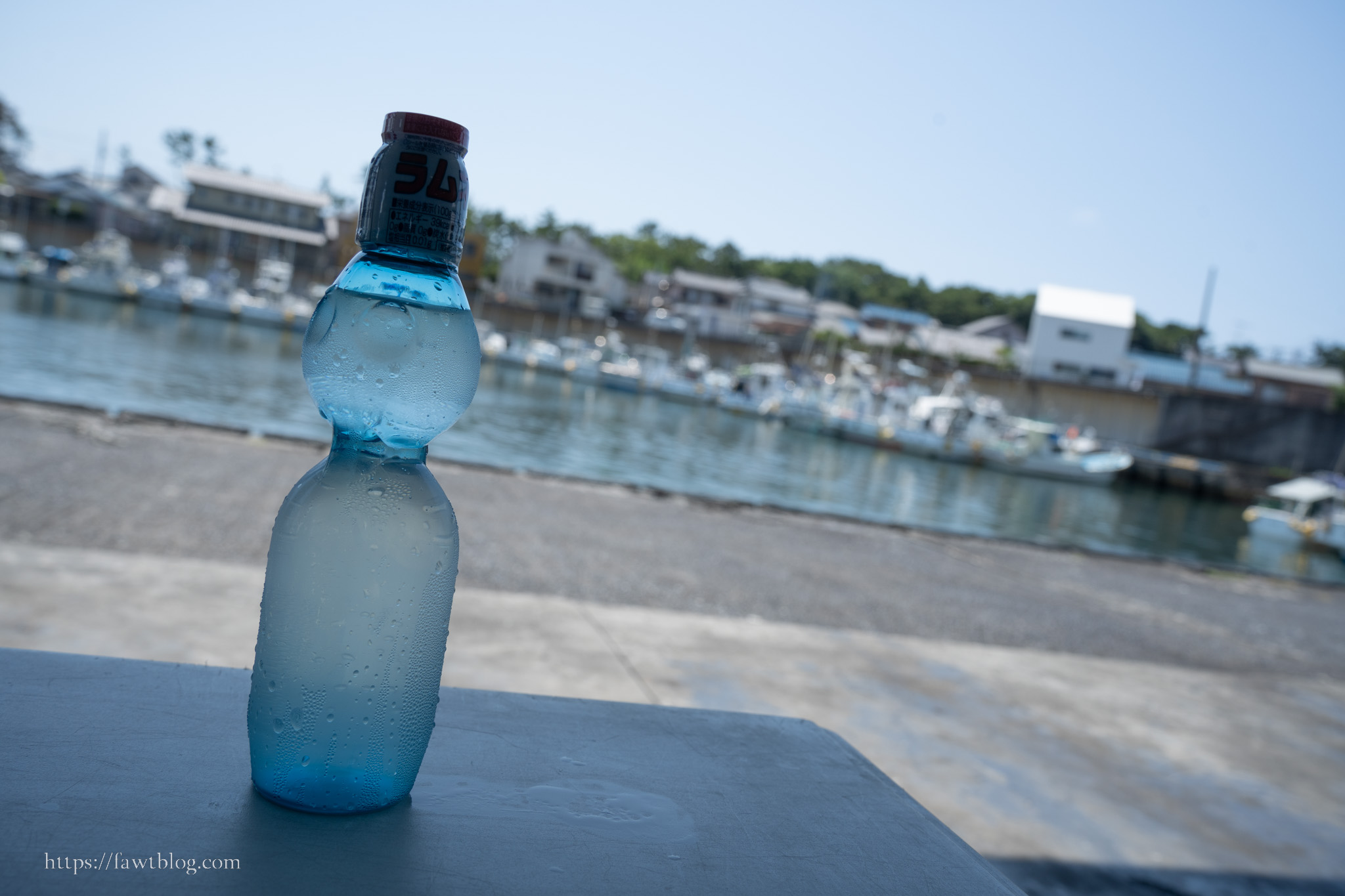 食券を買ったらラムネを飲みながら料理の完成を待ちます。なんて開放的な食堂でしょうね。夏をこれでもかと感じる心地よさ。