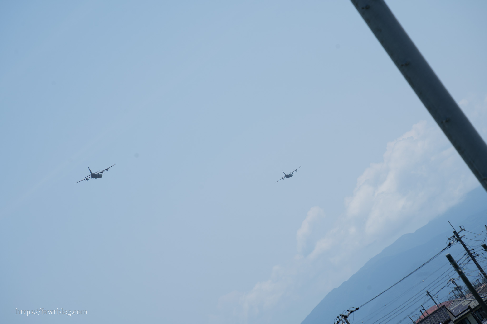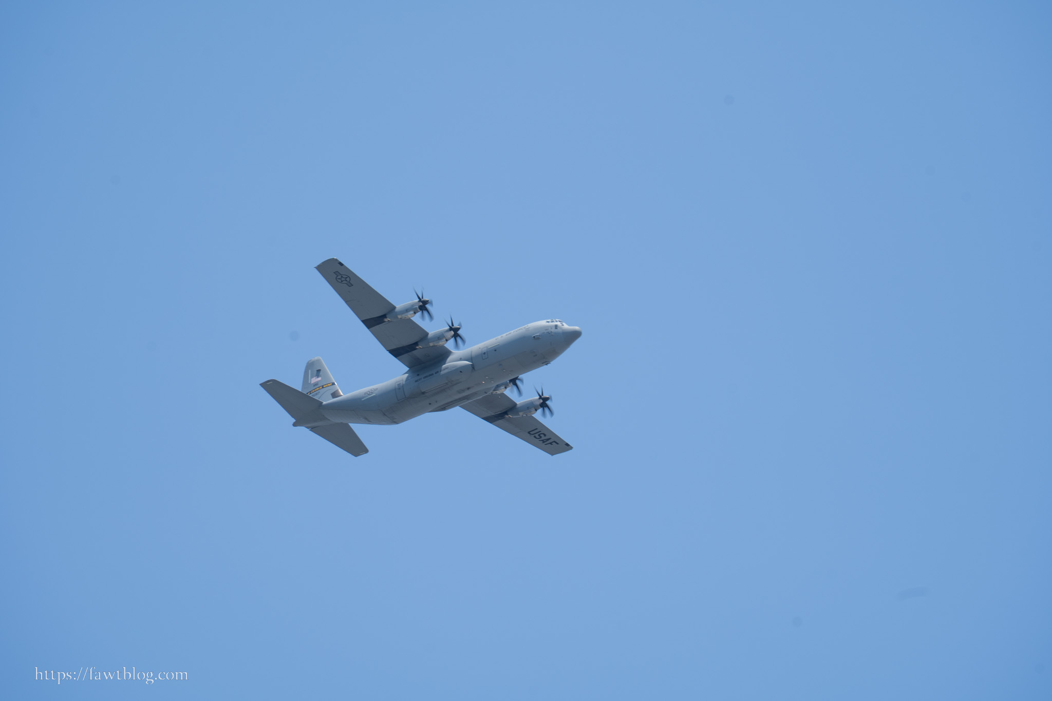 走っていたら空にも面白いものが。普通の飛行機とは違うなあと思ったら「USAF」の文字が見えました。アメリカ空軍……横田基地にでも向かっているのでしょうか。