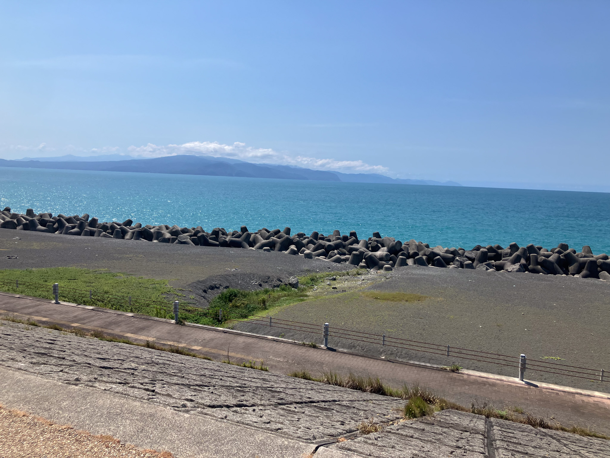 眼福という言葉がぴったりの、抜けるような青空のもとを走るサイクリングコース。少々強めの潮風も、この酷暑のなかではむしろ心地よく感じられます。